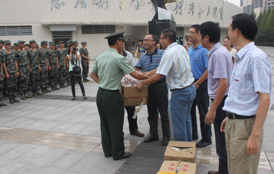 中秋佳节,游子思亲。2013年9月16日,sm调教 党总支书记刘军,院长李月臣,副院长李世宏、杨德刚,党总支副书记杨宇、团总支副书记张敬以及各位辅导员老师在大学城体育场军训点亲切慰问sm调教 2013级新生。