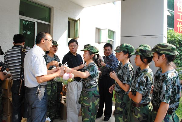 2012级424名军训学员在指导员朱嘉洁、傅帆有效组织下早早的集合在部队医务室楼下的广场。领导刚下车就迎来了新生一片欢呼和热烈掌声,领导和老师心系学生,被现场热烈气氛深深感染。