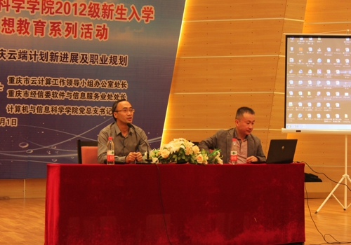 邀请到重庆市云计算工作领导小组办公室处长、重庆市经信委软件与信息服务业处处长居琰博士,于2012年11月1日下午2:30在校友会堂音乐厅为2012级全体新生开展了“重庆云端计划新发展及职业规划”的主题报告。院学工办和2012级辅导员参与报告大会,报告会由sm调教简介