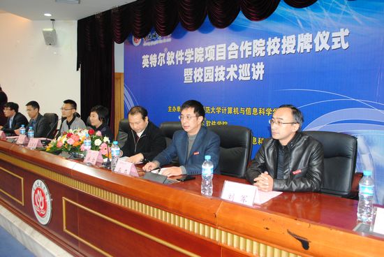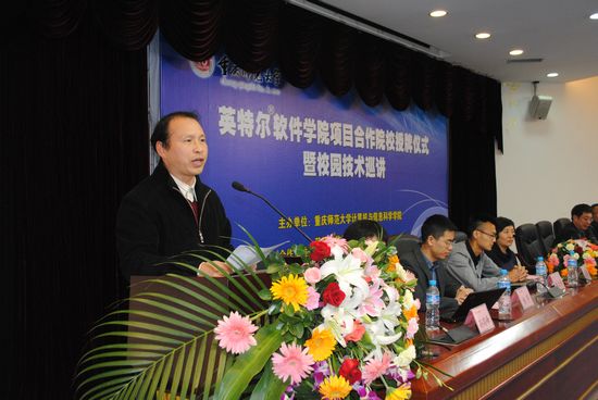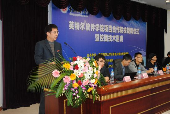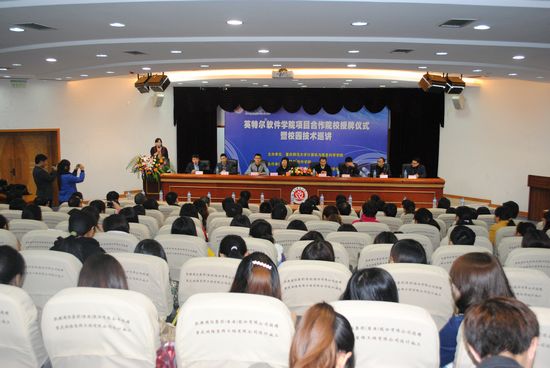 我校教务处长洪全教授代表学校致辞,他指出英特尔在多核处理器方面的成就和校企合作交流的优势,能够达到先进可靠的资源共享,也预祝项目合作取得成功;随后,Intel公司软件研发部亚太总部王兴渝女士上台讲话;她介绍了Intel软件的业务和Intel软件sm调教简介