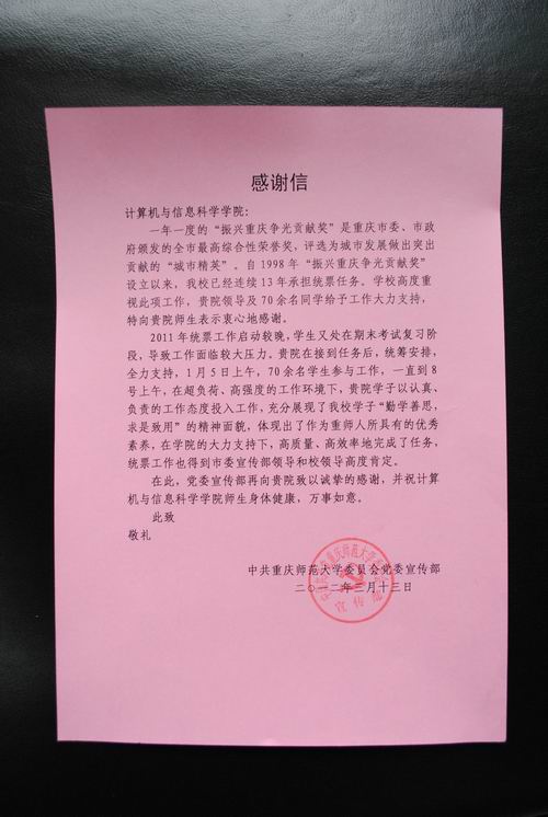 收到了校党委宣传部关于2011年度“振兴重庆争光贡献奖”统票工作的感谢信。