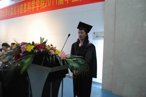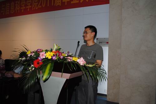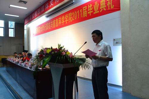 典礼上,学生邓晓霞和戴川作为2011届全体学生代表,向sm调教简介 赠送了毕业纪念品——计信加油战鼓一套,表达对sm调教简介 领导和老师的衷心感谢,刘军书记代表sm调教简介 接受赠礼并击鼓激励人心,全体同学起立高呼:“计信计信,团结奋进!”,雄壮的口号在报告厅久久回荡……随后,刘书记致辞,殷切地希望各位毕业生志存高远、勇于实践、增长才干,创造佳绩、回报母校、报效祖国。