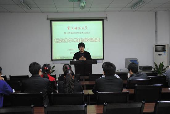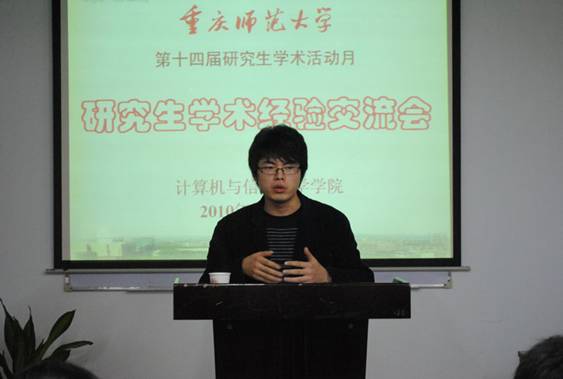 研究生学术经验交流会在集贤楼233会议室举行。会议由李明勇老师主持,本次交流会邀请了四位高年级优秀研究生——李阳、廖安军、邬啸、韩建超为做客嘉宾。他们就科研及生活中普遍关注的话题,结合自己的实际经验,各抒己见,表达了自己的观点,提出了宝贵的意见。这次交流会旨在给10级新生提供一个与老生交流的机会,开阔同学们的科研思路。