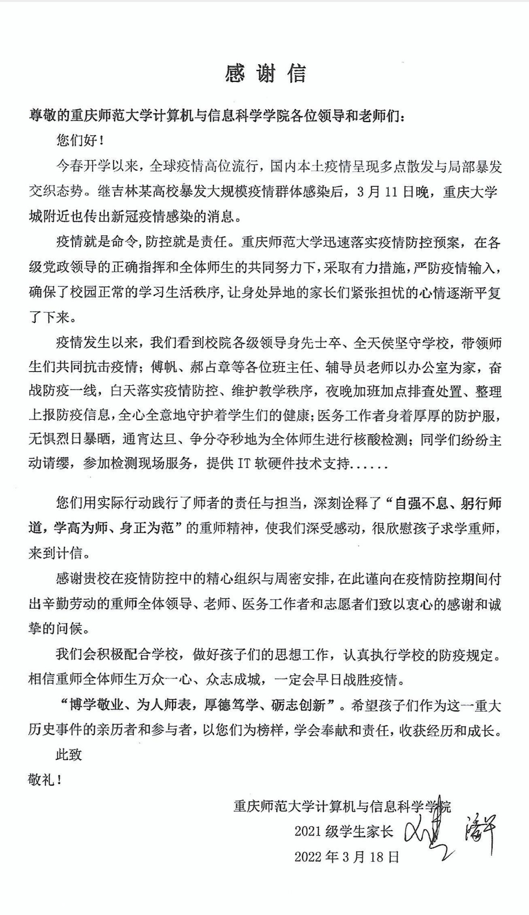 领导、老师们的感谢和慰问。2021级计算机类3班王颢潼学生家长,还专门来信感谢sm调教简介