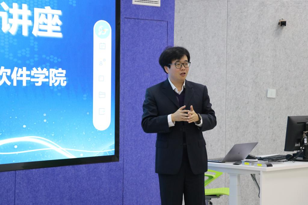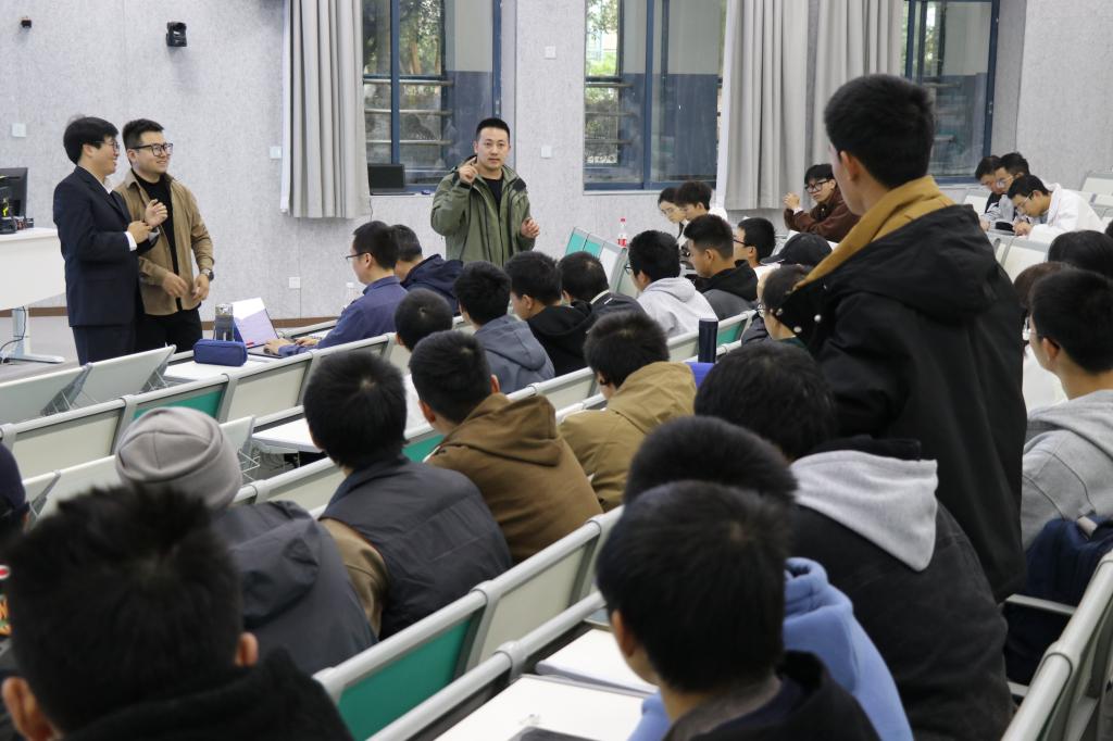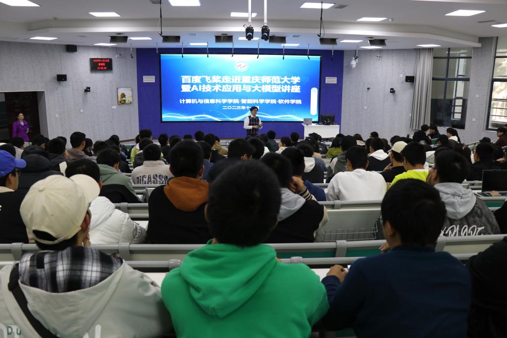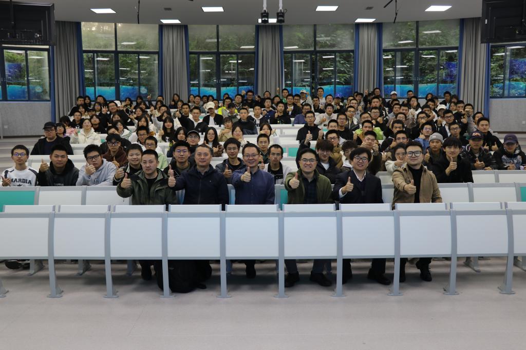 百度飞桨领航团长张青军和软件工程与智能科学专业的一百余位学生。讲座由sm调教