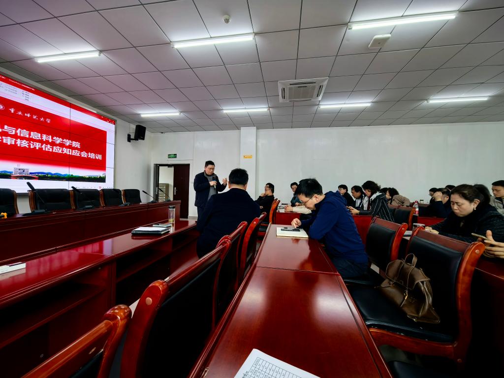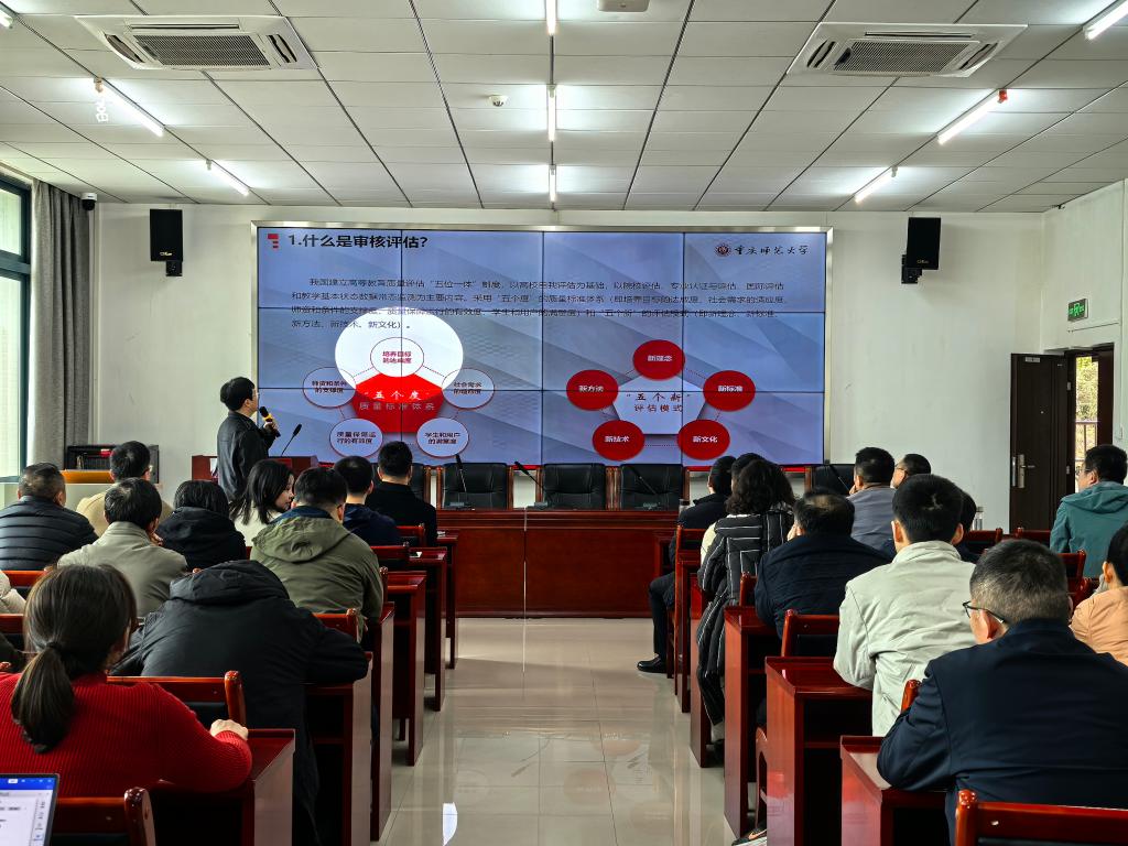 实际情况,对评估工作的重点内容、关键环节及具体要求作了详细解读;重点对教师的教学规范、课程建设、教学档案整理等作了系统培训,要求教师们严格按照学校教学规范要求,高质量完成教学工作,熟悉所教授课程的教学内容和教学要求,融入课程思政元素,并做好各类教学档案的规范整理。同时,会议强调了学生在教育教学中的地位,学生对教学质量的认同度是评估的重要方面,要积极引导学生以良好状态参与到评建工作中。