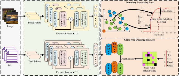 论文针对当前跨模态哈希方法在类间边界模糊的问题,提出一种深度判别边界哈希框架,以提升跨模态检索中生成哈希编码的判别性。为实现上述目标,设计两个核心模块:针对Sigmoid和Cauchy似然函数在梯度优化方面的局限性,设计重映射策略与基点自适应选择机制,将梯度较小的样本重新投影至梯度较大的区域,并增强“困难样本”的贡献,促进哈希空间更具判别性;然后,引入类别先验矩阵,将类别信息直接注入哈希学习过程,从而生成具有更强判别性的二值表示。实验结果显示,该方法在MIRFLICKR-25K、NUS-WIDE、MS COCO等多个主流数据集上显著优于现有方法,验证了其在跨模态相似度建模与语义对齐方面的有效性。