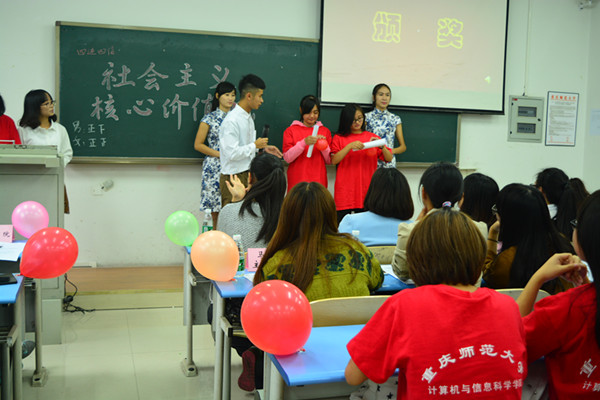 在主持人林小健、李小晴激情开场:“只要爱国、敬业、诚信、友善,就有希望让社会变得自由、平等、公正、法制,而国家才会更加富强、民主、文明、和谐。“接下来,由主持人带领大家合唱的歌曲《我爱你中国》可谓是激情飞扬,它真挚地表达了同学们对祖国的热爱。随后,主持人介绍了由习近平总书记提出的“四进四信”的基本含义,四进即“进社团、进支部、进团课、进网络”,四信即“信仰、信念、信任、信赖”。同时,同学们还表演了一段四进四信版“小苹果”舞蹈,收获了观众无数掌声与欢笑的同时,更在愉悦中让大家加深了对“四进四信”的记忆。活动接近尾声时,同学们玩了猜字和抽学号答学习心得的游戏。同学们纷纷表达了这次活动不仅有欢笑,更有收获。最后,师生合影留住了难忘瞬间,也为此次活动画上圆满的记号。