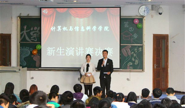 2014年11月27日15时许,以“迈好大学第一步,走好成功人生路”为主题的新生演讲决赛在弘德楼5105隆重举行。本次比赛由14级计科1班班长和14级信管班长担任主持人。到场的评委及嘉宾有sm调教 党委副书记杨宇,13级辅导员朱嘉洁老师,以及第六届学生会书记张聪杰、主席刘玉立、办公室主任彭翰迪、生活部部长徐政等。