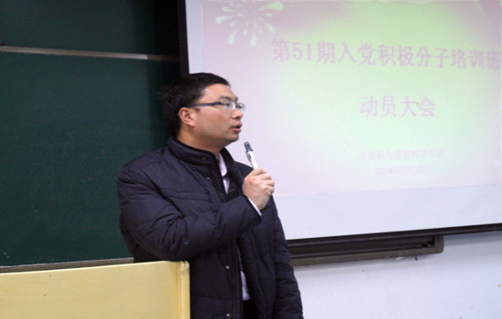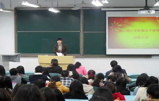 朱嘉洁老师简单介绍了本次党校培训班的班级建制、上课时间、课程内容等基本情况,接着,培训班临时团支部支书陈楚娟代表全体参训学生发言,她结合自身经历激励在场的入党积极分子严格要求自己,早日成为一名真正的共产党人。最后,杨发表讲话,他要求全体同学端正入党动机,需要严格按照一个党员的标准要求自己,成为学习的楷模,遵章守纪的标兵,不失计信学子风范。在讲话中,杨宇副书记反复强调了参加党校学习的组织纪律性。本次动员会对进一步提高入党积极分子的思想政治觉悟,对深入开展sm调教