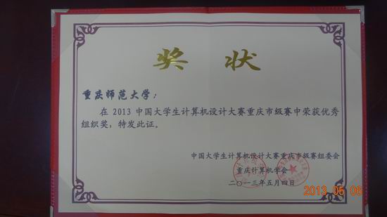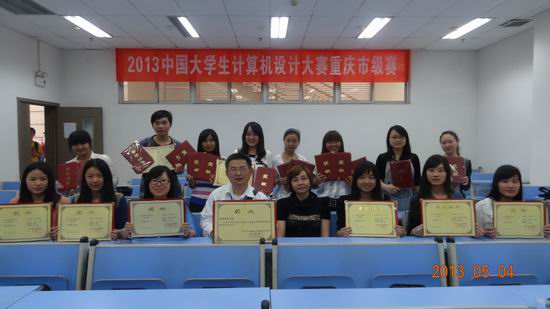 2013中国大学生计算机设计大赛重庆市级赛于2013年5月4日在重庆大学A区主教学楼拉开帷幕。在此次比赛中,sm调教 精心组织,由兰晓红、戴政国等老师亲自带队指导,从20多个团队中层层赛选并细心培训,推出参赛的9个团队经过激烈的竞争均获殊荣,分别为一等奖1个(付汝娟、王欣、汤茂藜),二等奖3个(秦倩、刘清清、王凤;王敏、石远洋、李莉;陆海香、韦晓静、牟莉),三等奖5个(秦倩、刘清清、王凤;罗瑶、邹益、孔妍君;徐关玉、董小芬、孔妍君;冉映萍、刘昶、江芸;徐关玉、董小芬、孔妍君),其中获得一二等奖的四个团队成功晋级全国决赛。此外sm调教 还荣获2013中国大学生计算机设计大赛重庆市级赛优秀组织奖。    据悉,“中国大学生计算机设计大赛”是由教育部高等学校计算机科学与技术教学指导委员会、教育部高等学校计算机基础课程教学指导委员会、教育部高等学校文科计算机基础教学指导委员会联合主办。目的是提高大学生综合素质,具体落实教育部高等学校计算机基础课程教学指导委员会编写的《高等学校计算机基础教学发展战略研究报告暨计算机基础课程教学基本要求》,以及教育部高等学校文科计算机基础教学指导委员会编写的《文科类专业大学计算机教学要求》,进一步推动高校本科面向21世纪的计算机教学的知识体系、课程体系、教学内容和教学方法的改革,引导学生踊跃参加课外科技活动,激发学生学习计算机知识技能的兴趣和潜能,为培养德智体美全面发展、具有运用信息技术解决实际问题的综合实践能力、创新创业能力,以及团队合作意识的人才服务。