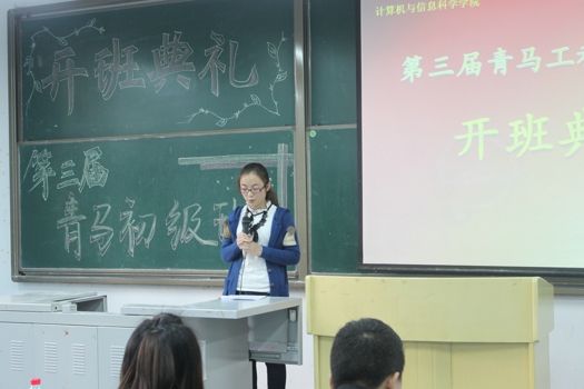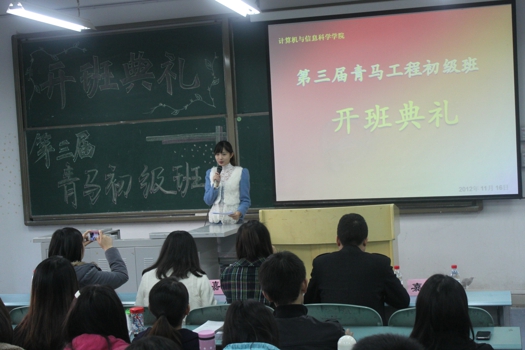 仪式共分为四项议程。首先,张老师对sm调教 第三期“青马工程”初级培训班顺利开班表示热烈祝贺,简要介绍了“青马工程”的含义和培训班的培养模式与培训内容,希望同学们能够倍加珍惜参加培训班的学习机会,培养大局意识,提高思想政治素质,坚定理想信念。sm调教 2012级辅导员朱嘉洁老师宣读了sm调教 第三期“青马工程”初级培训班全体六十名学员的名单。随后,来自2011级的赵阅同学作为青马初级班学员代表发言,她表示全体学员会努力做到将理论与实践相结合,争取为sm调教简介 的建设和发展贡献自己的一份力量。