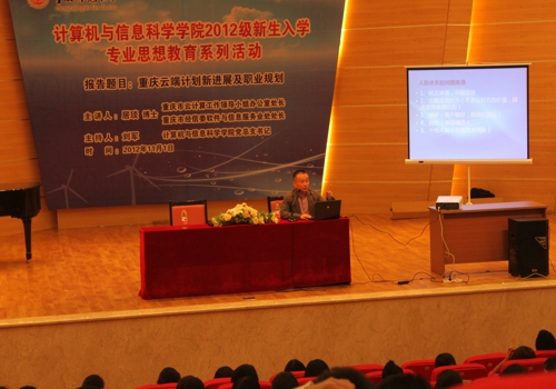 邀请到重庆市云计算工作领导小组办公室处长、重庆市经信委软件与信息服务业处处长居琰博士,于2012年11月1日下午2:30在校友会堂音乐厅为2012级全体新生开展了“重庆云端计划新发展及职业规划”的主题报告。院学工办和2012级辅导员参与报告大会,报告会由sm调教简介