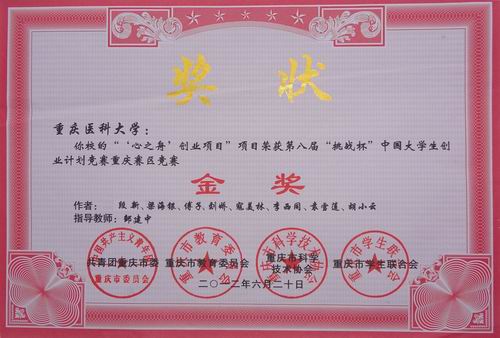 2009级计算机科学与技术专业学生段新与重庆医科大学学生组队申报的“‘心之舟’创业项目”项目荣获第八届“挑战杯”中国大学生创业计划竞赛重庆赛区金奖。