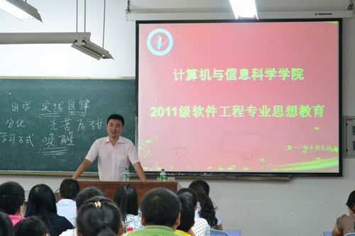 为帮助sm调教 新生转换角色、合理定位,明确专业方向与前景,2011年10月9日下午,sm调教 特安排了电子商务与信息管理系主任李明教授,计算机科学与技术系主任陈勇副教授、软件工程系主任龚伟老师在弘德楼对sm调教 2011级新生进行专业指导教育。