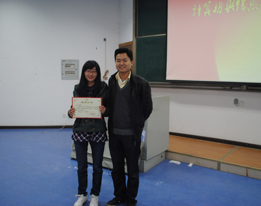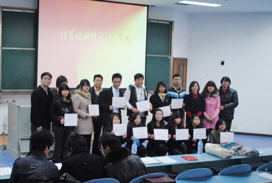 下午4:00,在一片热烈的掌声中大会正式拉开帷幕。首先,精彩的PPT播放激奋人心,让大家感受到作为计信人特有的骄傲。最期盼也最令人激动的颁奖环节紧随其后,张敬老师公布获奖名单后,老师们在激昂的乐曲声中为获奖者一一颁发荣誉证书。大会最后,张敬老师发表讲话,对2010年的工作进行了简要而中肯的总结:“苦”和“荣”并存。同时,他对2011年作出了展望与规划,并着重介绍了目前正在建设中的涵盖了计信e家人、学生动态信息管理以及静态信息管理三个部分的“学生管理系统”,旨在两年内形成sm调教