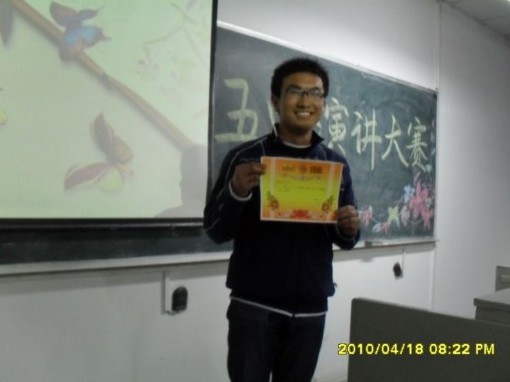 本次比赛共有11位同学参赛,各位选手各显其能,演讲有声有色。他们时而高亢,时而低沉,时而潸然垂泪,时而热血沸腾,为国家、为民族、为中华儿女、为父母,谱写了一曲曲感人至深的赞歌,引得现场掌声不断。本次比赛共评出一等奖1名、二等奖2名、三等奖3名及优胜奖5名,其中08级戚宏涛同学摘得桂冠。