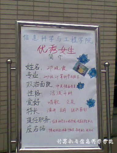 07级的两名女生邓晓霞和李海燕以她们优异的成绩和先进的个人事迹引来了过往女生的参观和称赞。“风采转转转”是为了增强各院交流、突出本院特色,展现本院女生风采的特色节目。sm调教