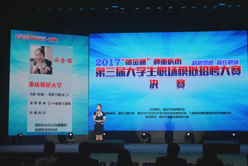 2017年6月19日,由重庆市教委主办,重庆工商大学、重庆市大学中专毕业生就业指导服务中心、上海财金通教育投资股份有限公司联合承办,重庆市金融发展服务中心协办的“财金通”杯重庆市第三届大学生职场模拟招聘大赛决赛在重庆工商大学举行。本次大赛以“超越梦想·赢在职场”为主题,旨在突破传统就业教育模式,增强大学生对职场的认知,提升就业竞争能力。
