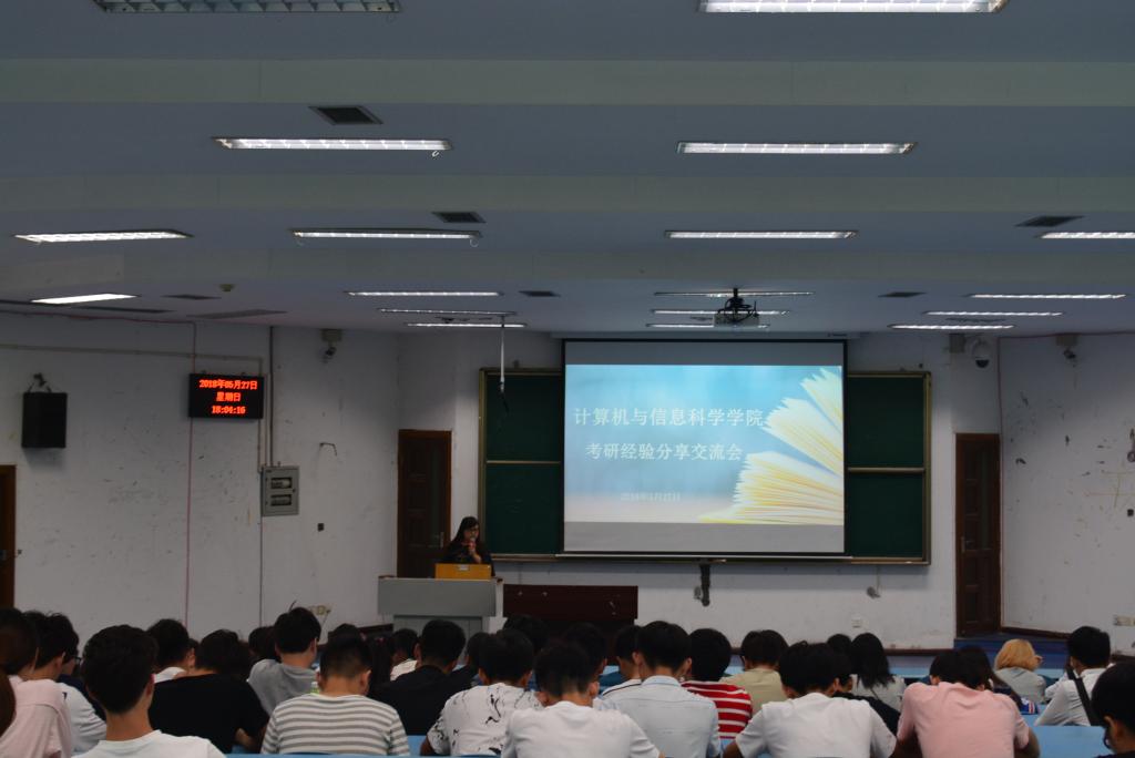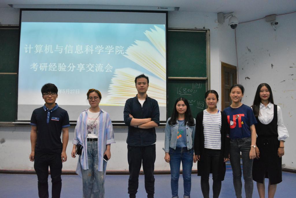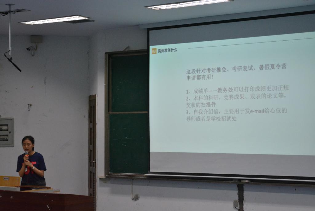 2014级计算机科学与技术专业的邱雨檬(重庆邮电大学研究生),她向大家详细介绍了计算机专业考研的要点、技巧以及学习方法。2014级软件工程专业的郭尔川(重庆邮电大学研究生),则强调了目标的重要性,要充分了解自己的目标学校,目标专业,正所谓“知己知彼,百战不殆”。2014级信息管理专业的王麒任(日本富士国际语学校研究生)则向大家分享了考取国外研究生的经验,并提醒同学们,在选择学校时也应该考虑地理因素、人文因素和家庭的经济条件。周媛(南京财经大学研究生)和余静(华中师范大学)则分享了跨专业考研的经验,张奕阳(浙江工业大学)分享了推免生应具备的条件和推免经验。