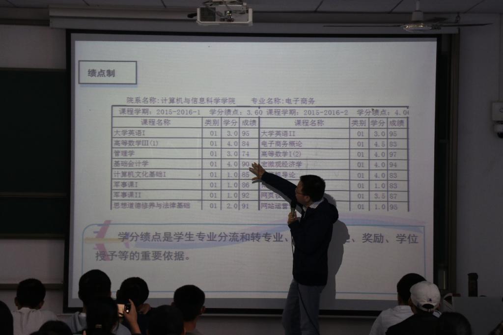 第二部分为课程管理。周主任从“人才培养方案”出发,带领同学们认识了大学中不同形式,不同种类的课程,并着重强调了通识选修课的类型和应修的学分。接着,他讲解了选课的方式、课程修读形式和纪律要求。使同学们了解到大学丰富多彩的课程类型,认识到了大学阶段不同于高中时期的授课方式。