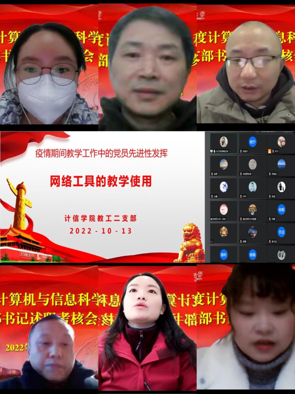 大会上,各位党支部书记逐一进行述职。教工一党支部书记谭华山老师谈到,教工一党支部始终坚持政治理论学习摆在首位,扎扎实实开展理论学习和形式丰富多样的主题活动,广大党员在疫情期间发挥先锋模范作用,下沉社区,发光发热;教工二党支部书记叶青老师介绍了疫情期间支部的业务工作与党建工作有机结合,支部教师党员交流探讨如何熟练运用网课平台,提高网课教学质量。叶老师还特别针对“网课爆破”这类突发事件,通过案例教学,生动演绎网络爆破模拟,让大家防患于未然,增强互联网课堂掌控本领;研究生一党支部书记宋婷婷老师详细介绍了支部本年度开展的组织生活,重点介绍了支部如何努力完善管理制度、打造特色亮点活动以及疫情期间党员同志的先进事迹;研究生二党支部蒋明宇老师谈到,本党支部将志愿活动与科研活动有机结合,着力打造以科研帮扶为主的志愿者活动,开展过两次大型的论文指导和竞赛指导现场交流活动,党员与群众双方展开科研思想碰撞,充分发挥朋辈互育,党员学生的领雁作用;研究生三党支部书记曹光老师谈到,研究生三党支部成立于2022年4月,自支部成立以来,把党建工作与日常工作紧密结合,同研究同部署,与支委会成员一道推进支部建章立制,小处着手,细微处发力,提升支部管理水平,充分展现新支部全新的面貌。本科生一党支部靳蜜静老师突出介绍了通过抓思想建设,鼓励党员注重专业融合和综合发展,培养了一批肯吃苦、能战斗、素质硬的党员先锋典型。学生二党支部书记刘宇老师结合样板支部建设过程,介绍创新学习机制,开展“党课我来讲”先锋课堂;学生三党支部钟华老师进一步打造支部特色,完善支部品牌,持续推荐党员培养教育计划,将学习、交流、表率、成果融为一体,推动支部建设走深走实。